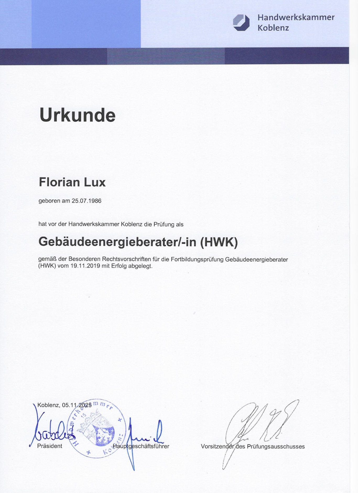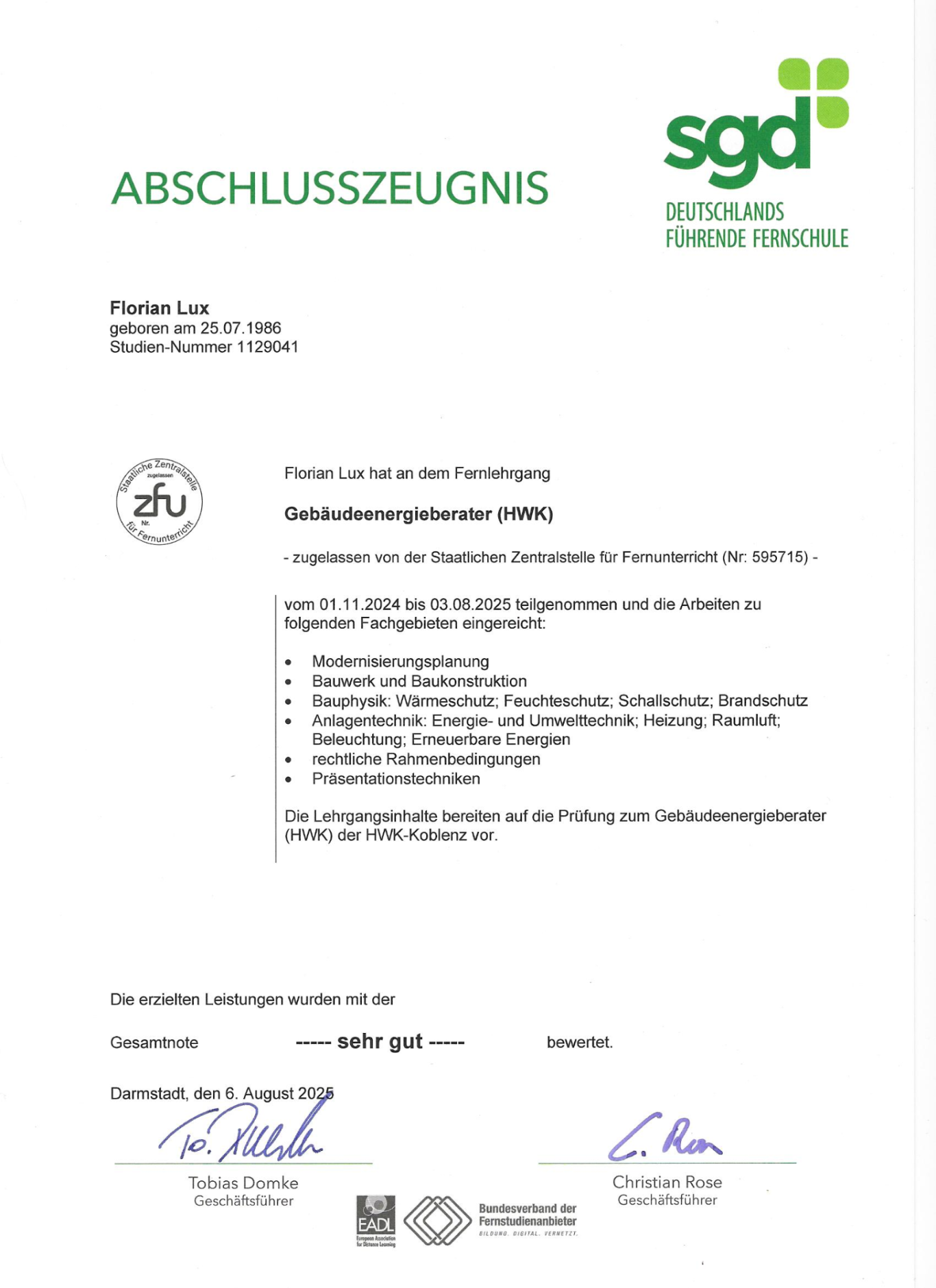 - 2025: Weiterbildung zum Gebäudeenergieberater, sgd